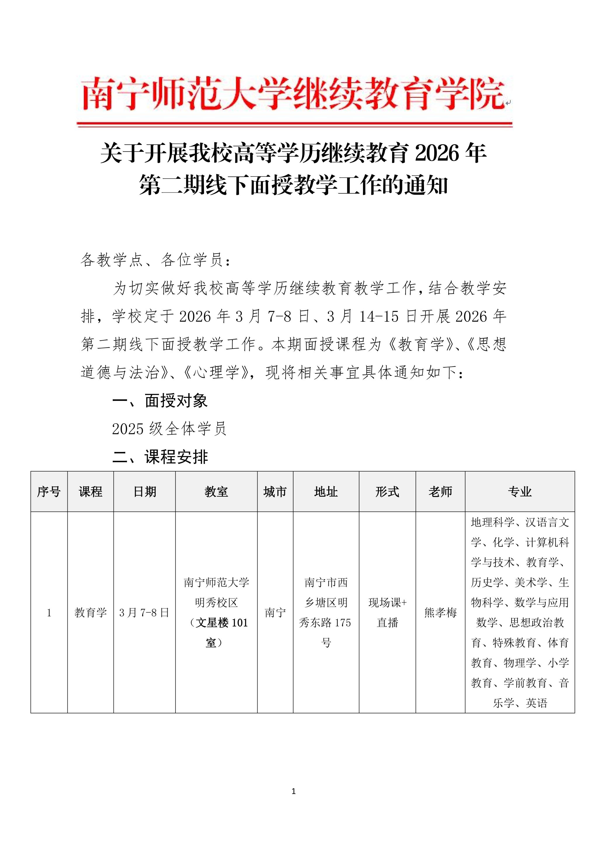 关于开展我校高等学历继续教育2026年第一期线下面授教学工作的通知