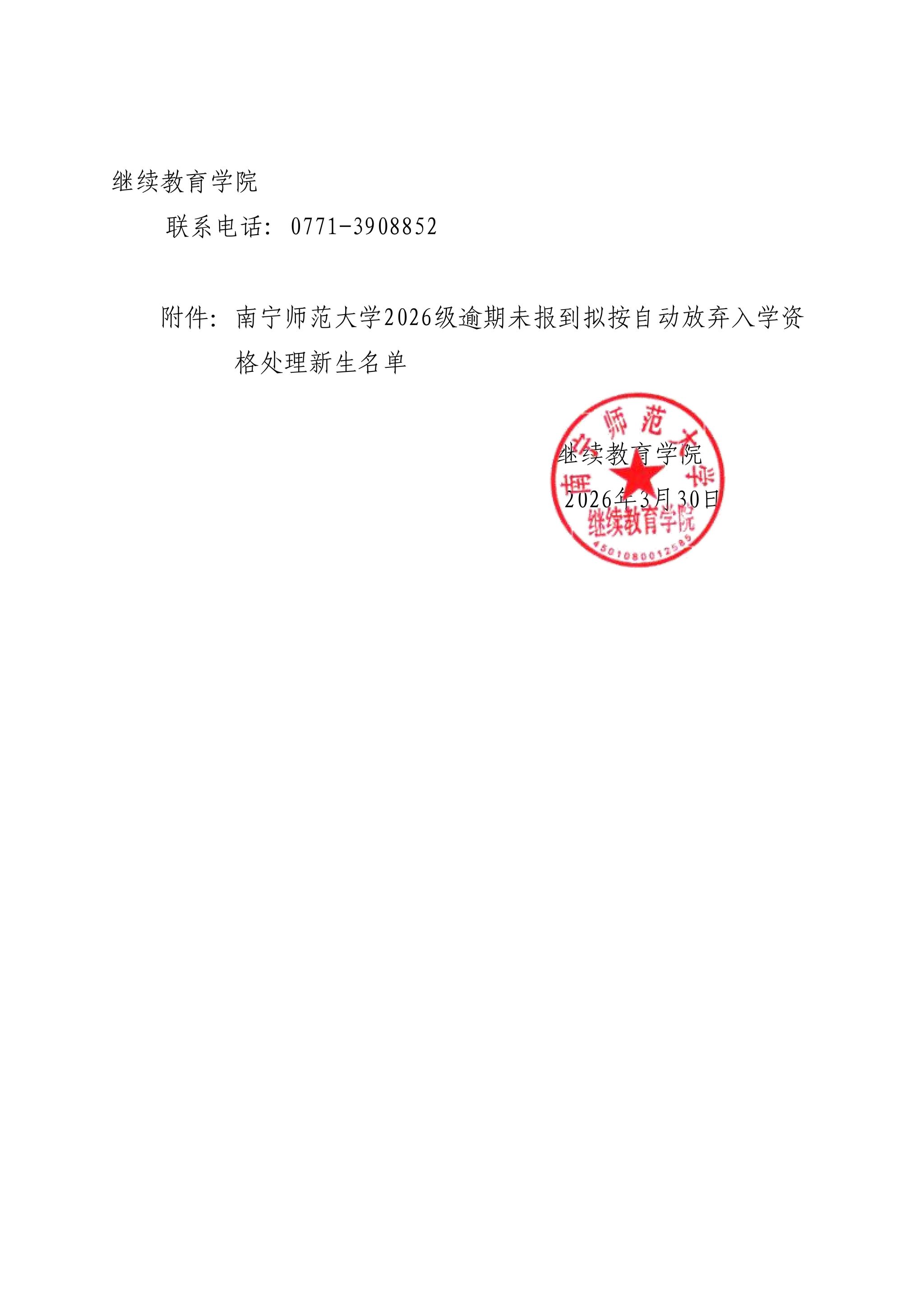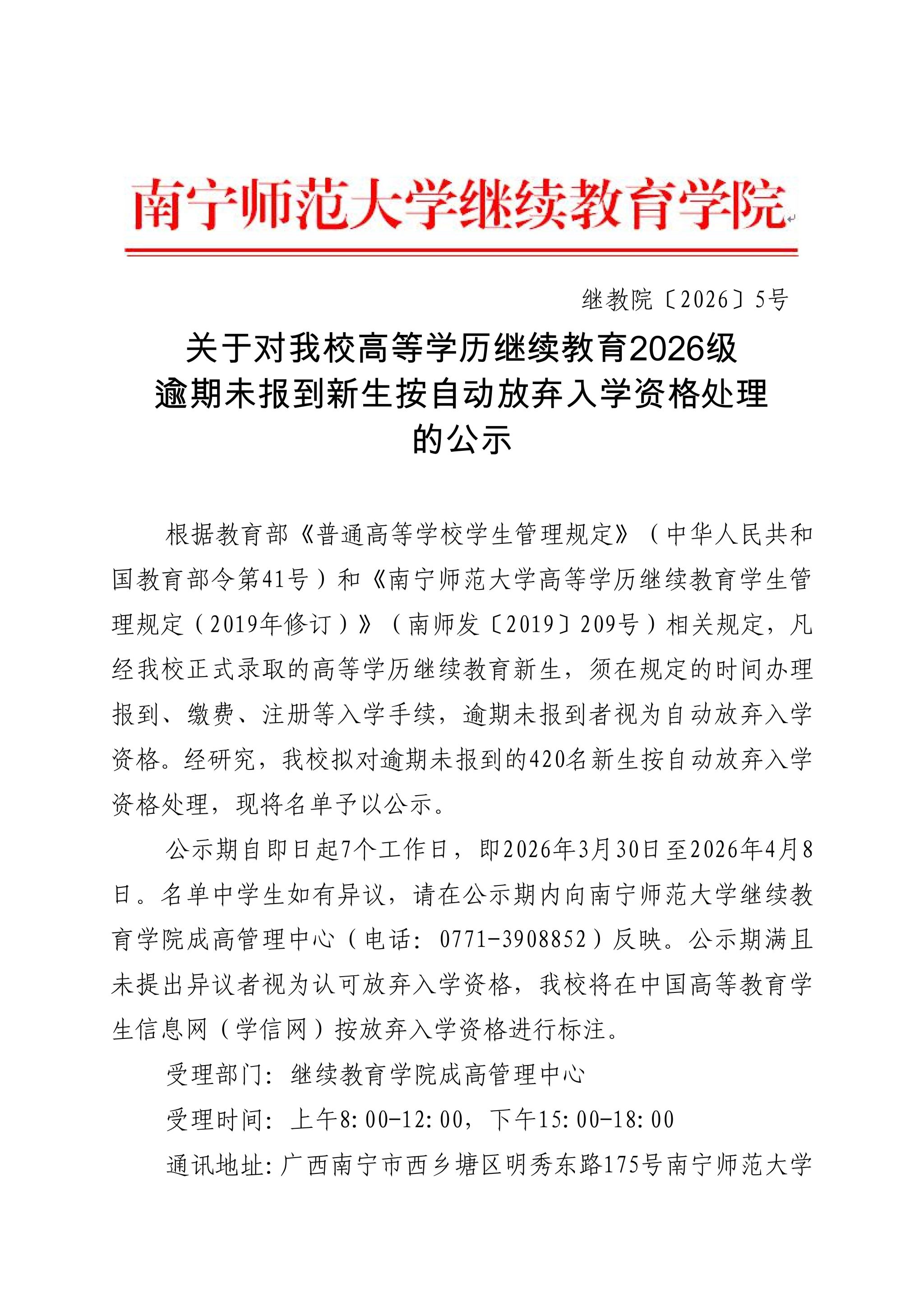 关于对我校高等学历继续教育2026级逾期未报到新生按自动放弃入学资格处理的公示